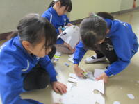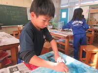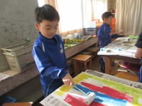 今日11月20日(水)の3・4校時、2年2組の子どもたちが、図工室前の廊下も活用して、図画工作科「たのしく うつして」の学習に取り組んでいました。