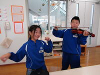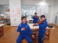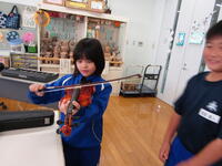 初めて触れる楽器に、はじめは少し緊張気味の子どもたちでしたが、スタッフの方にやさしく教えていただきながらバイオリンの音出しに挑戦。