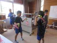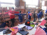 広いスペースが確保できる多目的室で、グループごとに集まって、踊りの練習をしたり、踊りで使用する衣装(小道具)を作ったり。