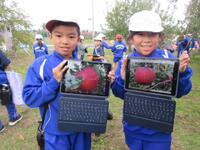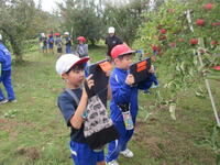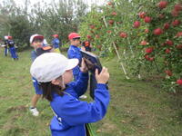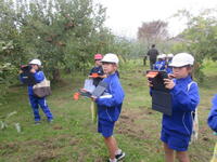 今日11月1日(金)の5校時、3年生は、総合的な学習の時間に、「リンゴの先生」の兒玉先生と宍戸先生にお世話になっているリンゴ農園に出かけ、リンゴの出来具合を観察に行きました。