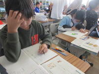 今日10月29日(火)の1校時、1組の教室では、学習のまとめとして、グループごとに「くらしの中の和と洋新聞」作りに取り組んでいました。