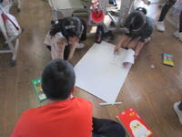お友だちと協力しながら、赤や緑、紫などのクレヨンを使って、楽しそうに色ぬりです。