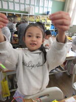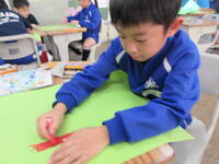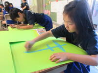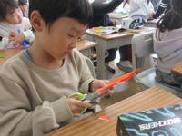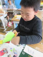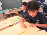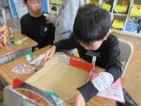 今日10月30日(水)の3校時、2年2組の子どもたちが、学習発表会で使用する小道具類を作っていました。