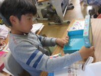 家から持ってきた空き箱に、色紙、モール、ビーズなどで飾りつけをして、宝物入れを作ります。