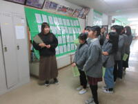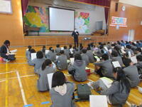 体育館での全体会では、生徒会役員の先輩から、中学校での一年間の活動について説明を受け、小学校と中学校との違いをさらに具体的にイメージできました。