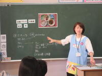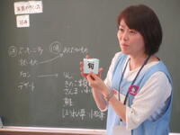 授業では、前半、体内での三つの働きにつながる「赤」「緑」「黄」の食品グループの食材を、バランスよく、しかも適切な分量、摂取することの大切さを教えていただきました。