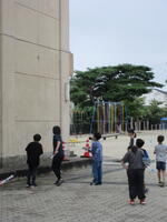 「よぉし!校舎の壁めがけて、だれが一番高く水が届くか競争だぁ!」