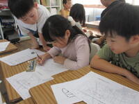 今日10月1日(火)の3校時、1組・2組それぞれの教室では、「たんけん計画書」をもとに、探検する場所やそこまでの道順、安全に気を付けて探検するためのルールやマナーなどを確認しあっていました。
