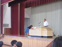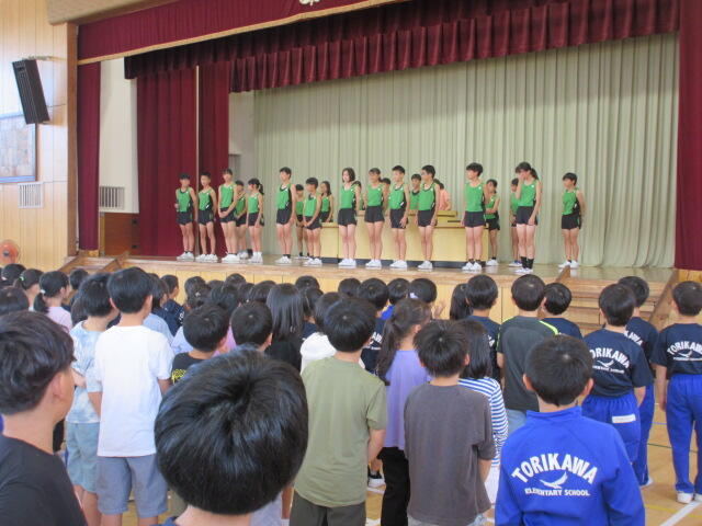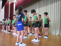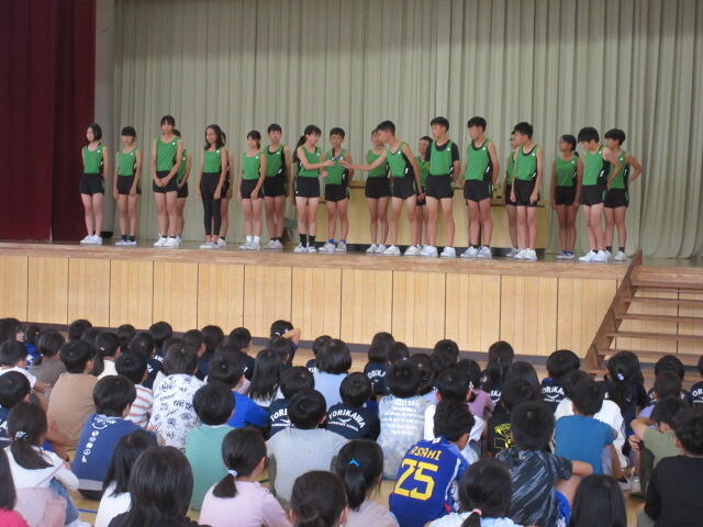 今日9月26日(木)の昼の時間に、5年生が中心になって企画した、市陸上競技大会の選手壮行会が、体育館で行われました。