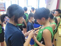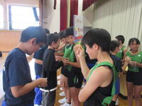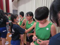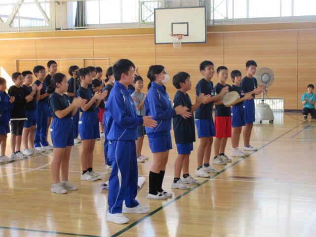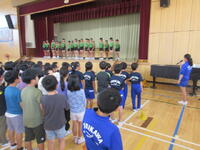 その後、サプライズとして、代表の友だちを送り出す6年生から、「心を一つに一致団結」のスローガンとともに、応援の気持ちの込められた「ミサンガ・キーホルダー」が選手一人一人に手渡され、さらに、オリジナル応援歌がプレゼントされました。
