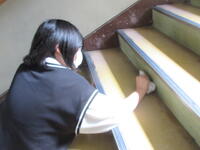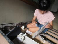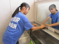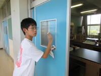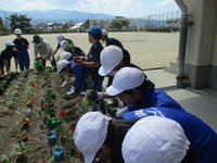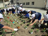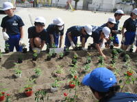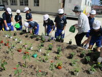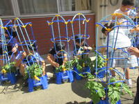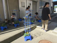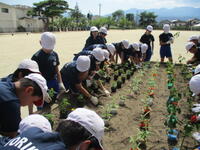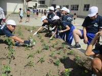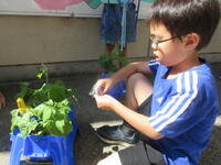今日6月20日(木)の1校時、1年生が生活科の時間に、アサガオの支柱を立て、追肥をあたえていました。