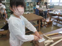 のこぎりで切ったり、釘を打ったりして、角材の形を変えながら自分が作りたいものを作る活動です。