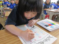 今日5月14日(火)の4校時、1年2組の教室では、先週土曜日の運動会を振り返って、学習カードに一番思い出に残った場面の絵と感想を記入していました。