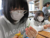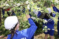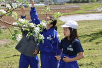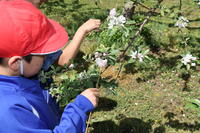 今日4月25日(木)2・3校時、3年生が総合的な学習の時間、地域にお住いの宍戸さんのリンゴ畑に出向いて、リンゴの花の受粉作業を体験しました。