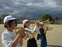 この時間は、初めて、実際に校庭で行進しながら演奏しました。