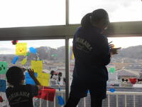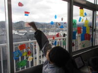 セロハン紙を切って、窓から見える景色が楽しくなるような飾りを作っていました。