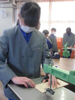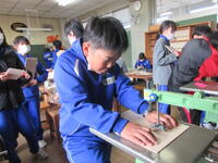 今日12月1日(金)の3・4校時、図工室では2組の子どもたちが、電動糸のこぎりを使って板を切ったり、切りとった板を組合せて貼り合わせたり・・・みんな楽しそうです。