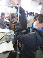 子どもたちは、ふりこの長さ、おもりの重さ、振れ幅(角度)の条件を確認し、メンバーで役割分担しながら実験を進めていました。