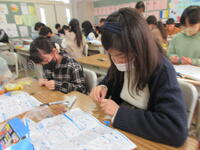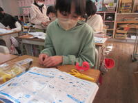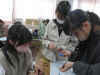 今日2月8日(木)の3校時、1組の教室では、このあとに電磁石の強さを調べる実験をするため、その下準備として、自分たちで鉄心に銅線を巻く活動に取り組んでいました。