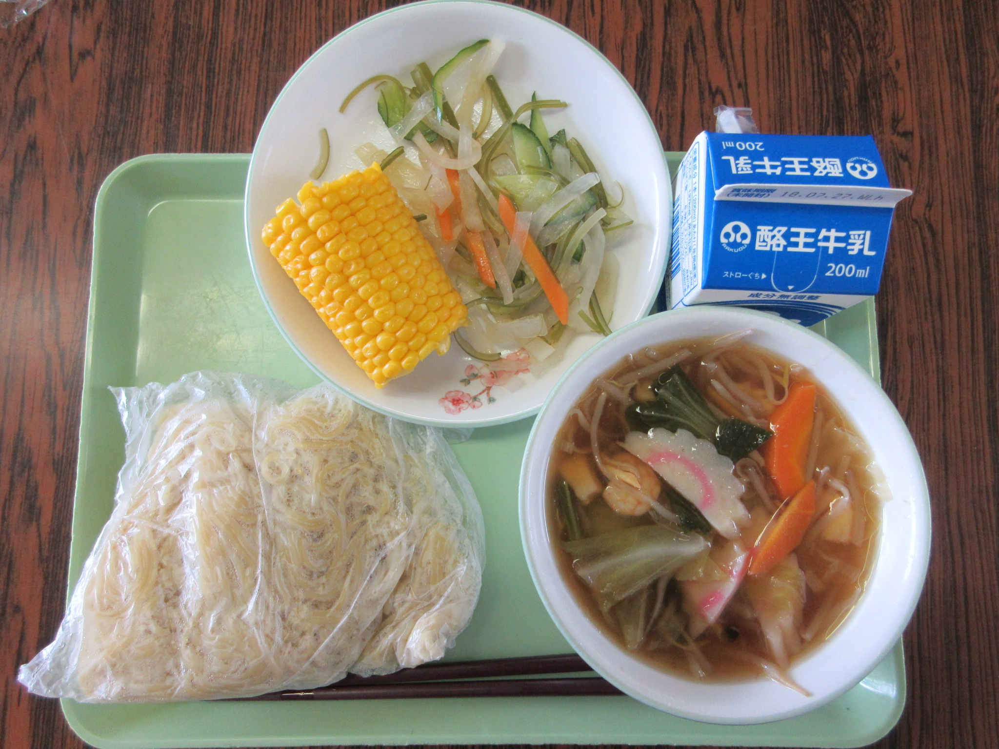 ちゃんぽんラーメン(中華麺)・茎ワカメのサラダ・蒸しとうもろこし・牛乳