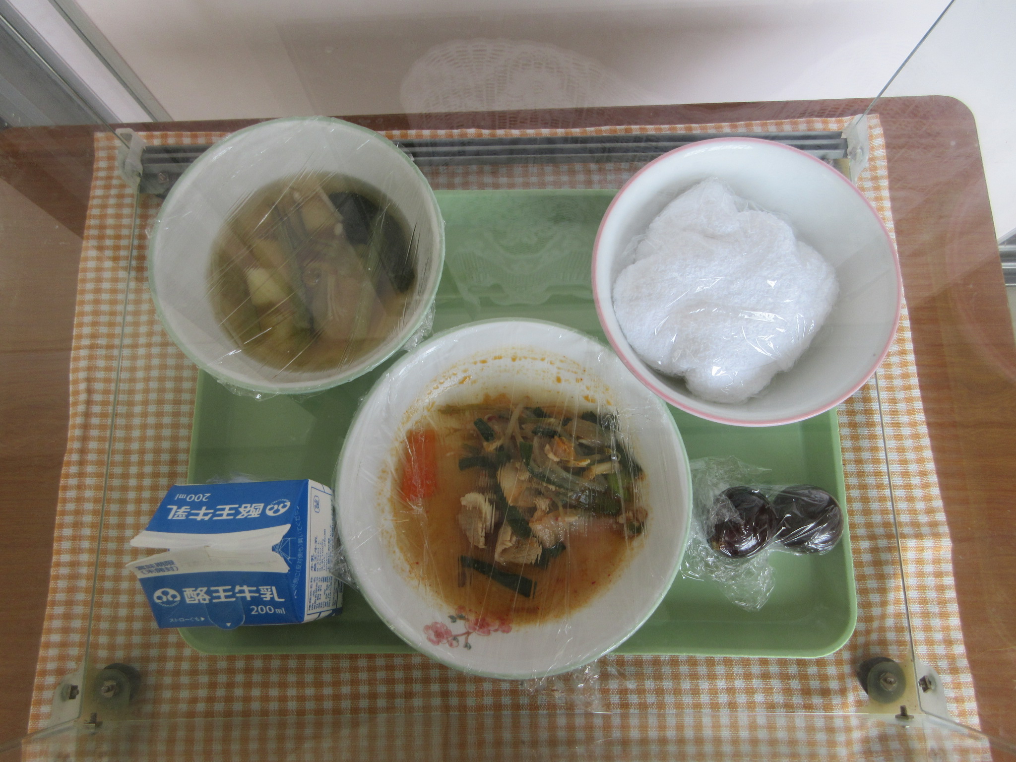 豚キムチいため・ジャガイモとエノキの味噌汁・ご飯・牛乳・ブドウ