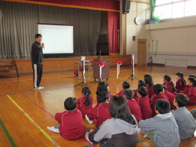 ご来賓として向鎌田町会長兼見守り隊会長の後藤様、PTA副会長の渡邉様、鈴木様をお招きしての会です。遊具の安全な使い方についてのお話を聞いた後、1年生代表5人にうれしい気持ちや遊ぶときの約束を発表してもらいました。