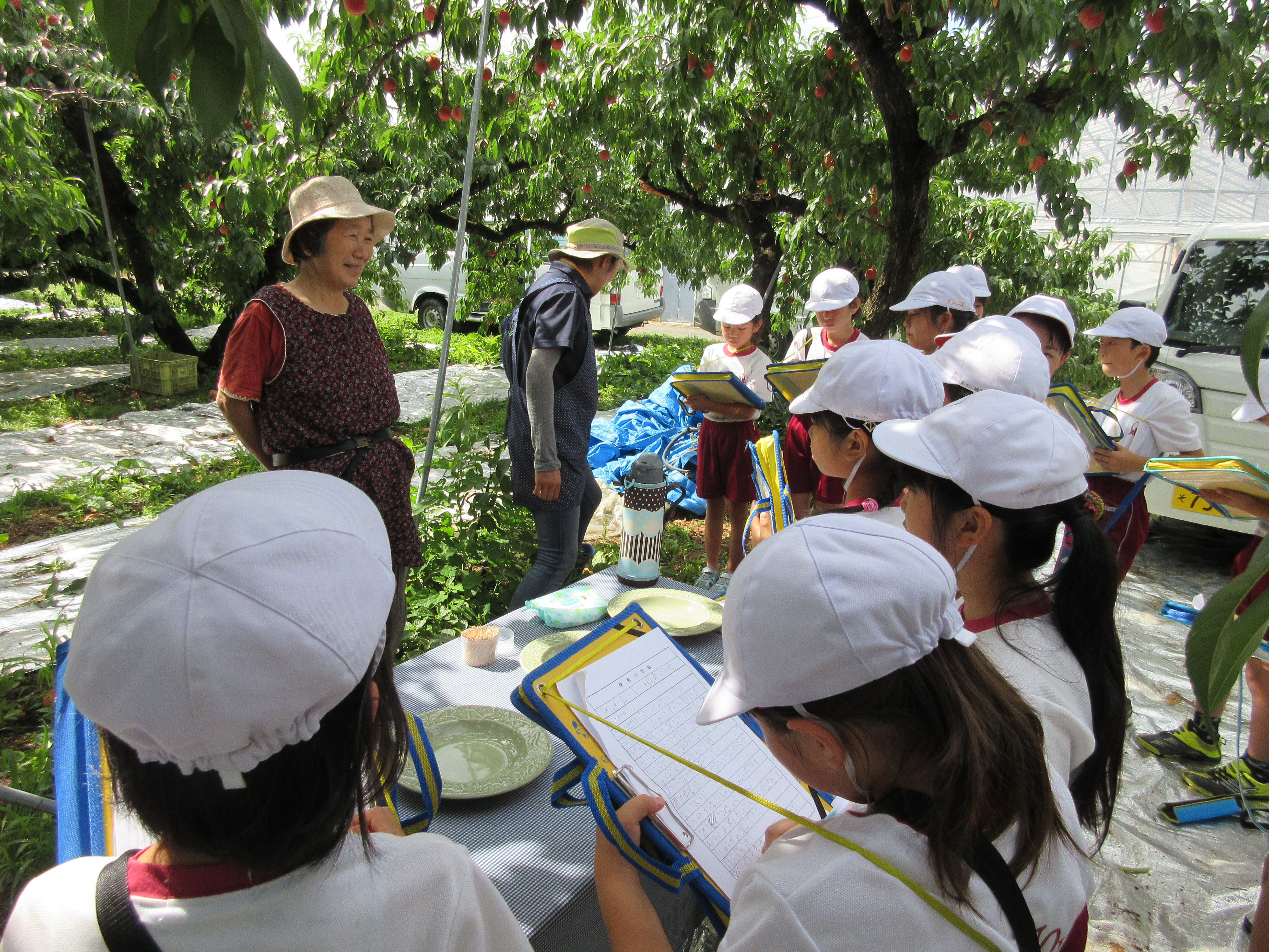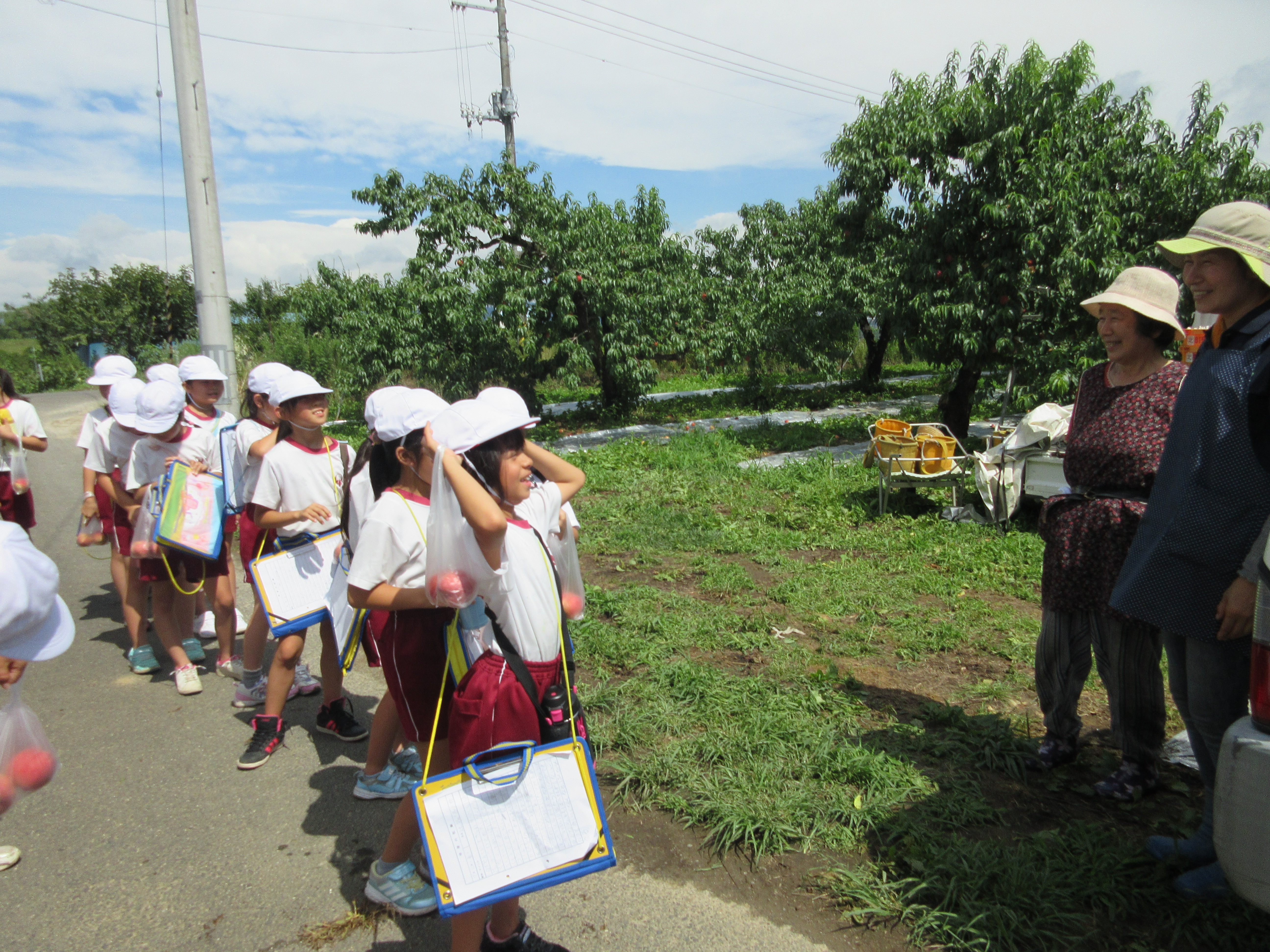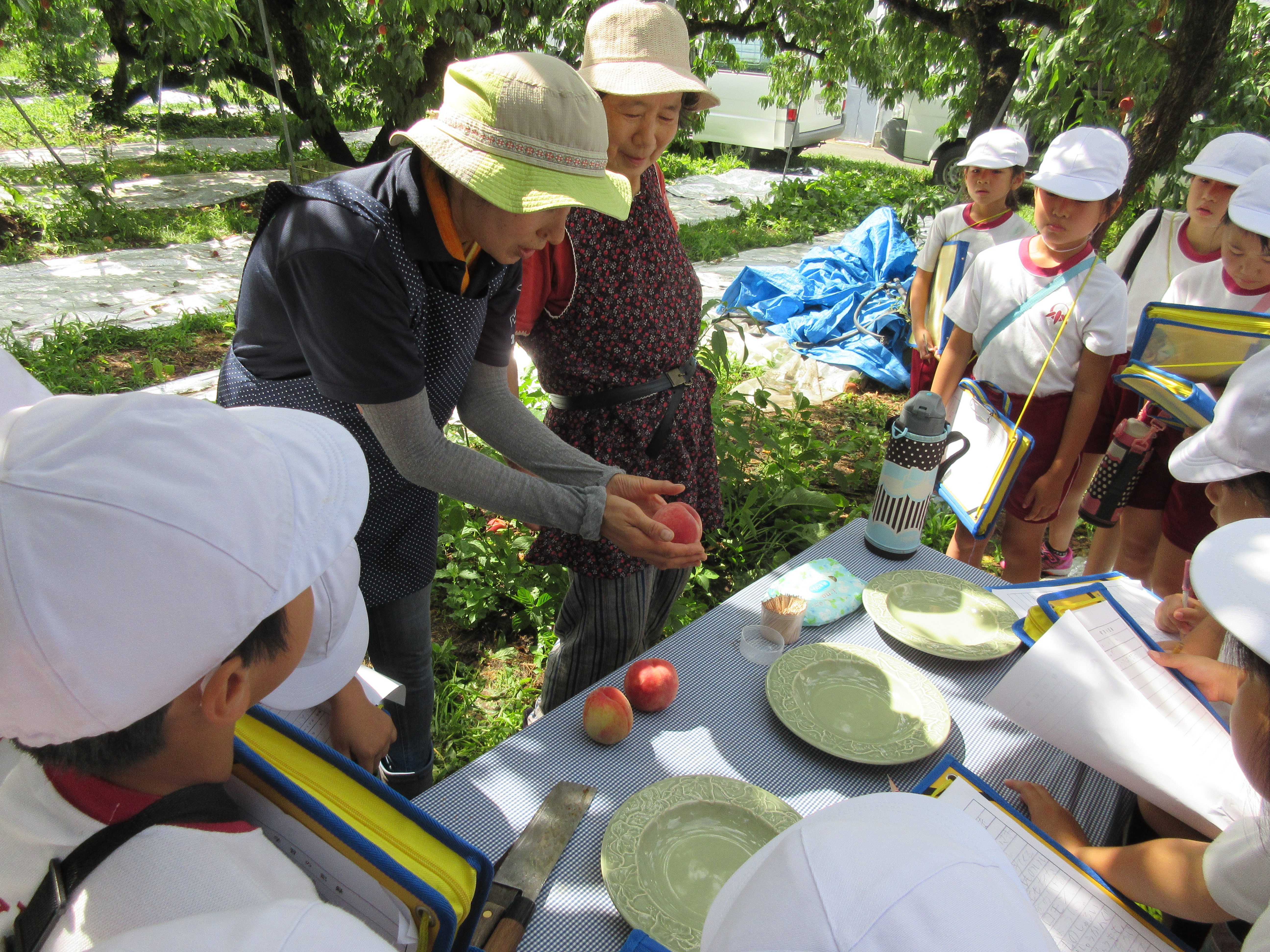 今年は、桃の実が生長する時期に雨が少なかったことから、やや小ぶりだそうです。でも、甘さは、例年どおりだそうです。子どもたちは、おいしい桃をご馳走になり、桃のお土産までいただきました。ありがとうございました。