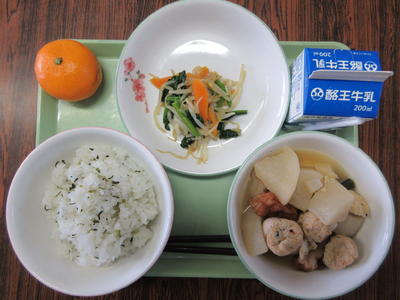 菜めし、牛乳、おでん、からし和え、くだもの(みかん)