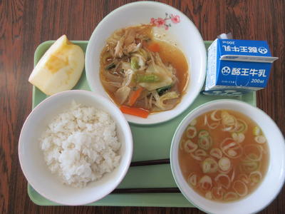 野菜炒め、大根とえのきの味噌汁、麦ご飯、牛乳、リンゴ