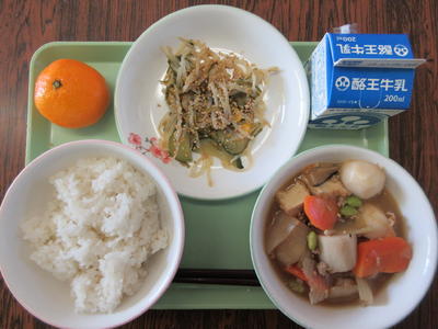 里芋のそぼろ煮、わさびドレッシングサラダ、麦ご飯、牛乳、ミカン