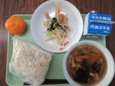 肉うどん、ワカメサラダ、牛乳、ミカン