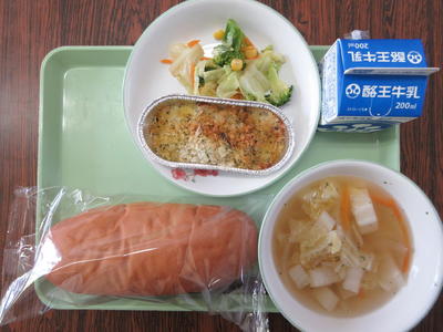 魚の香草焼き、ブロッコリーサラダ、鶏肉と野菜のスープ、コッペパン、牛乳