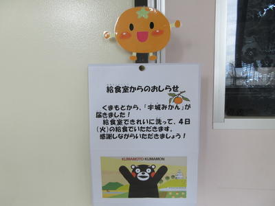 市教育委員会を通して、JA熊本宇城(うき)柑橘部会・生産プロジェクト班 様から「みかん」が学校に届きました。本日、給食時にいただきました。ありがとうございます。
