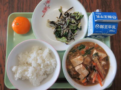 マーボー豆腐、中華ドレッシング和え、ご飯、牛乳、熊本宇城ミカン