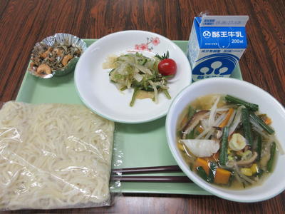味噌ラーメン、ナッツフィッシュ、茎ワカメのサラダ、牛乳、ミニトマト