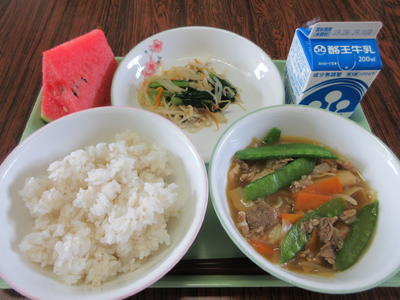 牛すき煮、おひたし、麦ご飯、牛乳、小玉スイカ