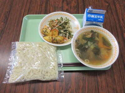 味噌ラーメン、大学いも、水菜と大根のサラダ、ご飯、牛乳