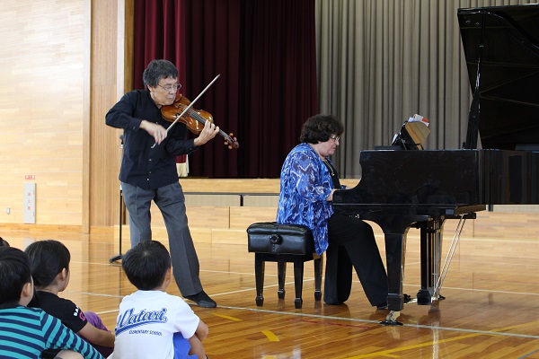 越しになり、2校時に下学年、3校時に上学年対象のミニ演奏会を開催されました。ご夫妻は、米国