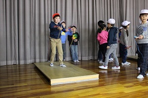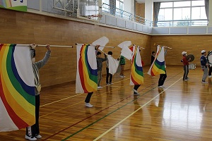 体育館後方では、5年生が鼓笛演奏の練習に熱心に励んでいるのです。同じ空間で違う取組がなされ
