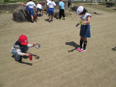2022年5月18日 18時35分さんさんと日ざしが降り注ぐ中、2年生の子どもたちが、校庭で立ったりしゃがんだりしています。
