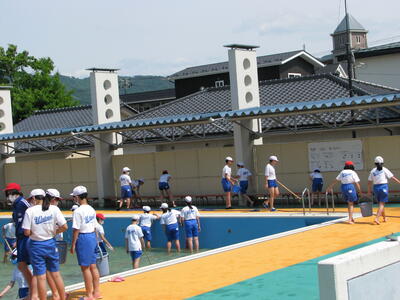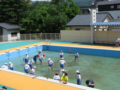 プールサイドやトイレ、出入り口付近、プールの中など、6年生全員が分担協力して、先生たちとともに作業に当たってくれました。