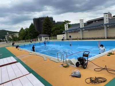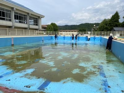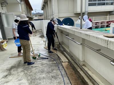 毎年保護者の皆様のご協力をいただきながらプール清掃を行っていましたが、三密を避けるために本校職員で清掃を行いました。