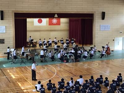 本日、体育館で全校集会を行いました。内容は、表彰披露、委員会活動発表、吹奏楽部激励会でした。