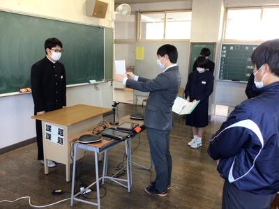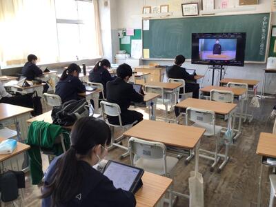 本日は感染症の感染拡大を懸念し、体育館で実施の予定であった今年度2回目の生徒総会を、急遽オンラインで実施しました。各専門委員会や部活動の今年度の取り組みの反省を2年生が堂々と述べ、全校生は各教室での参加となりましたが、緊張感のある有意義な総会となりました。今回の反省や改善点を来年度の取り組みに繋げていってほしいと思います。