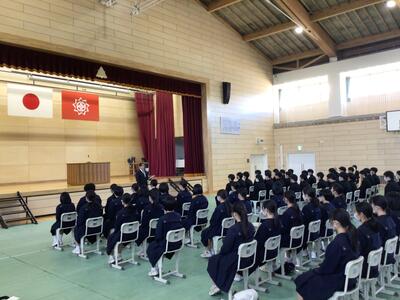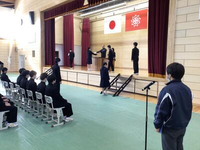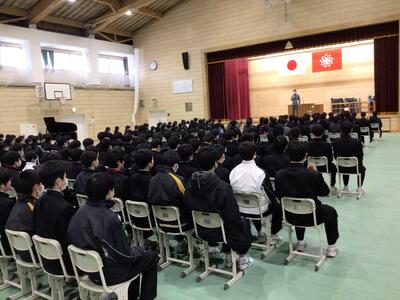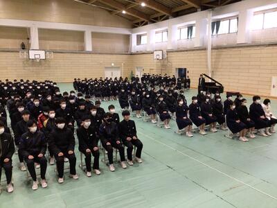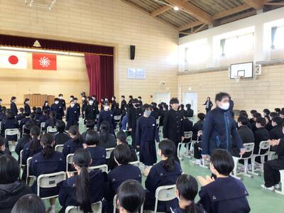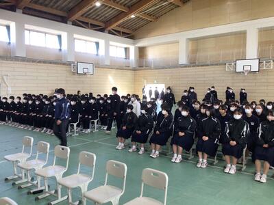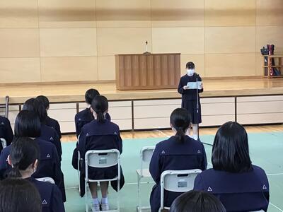 また、総会後は全校集会が行われ、表彰と、2年生と3年生の代表が「卒業式に向けて」の熱い思いを発表しました。卒業式本番まで、約1ヶ月となりましたが、練習を積み重ね、全校生で感動の式を作り上げたいと思います。