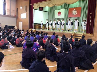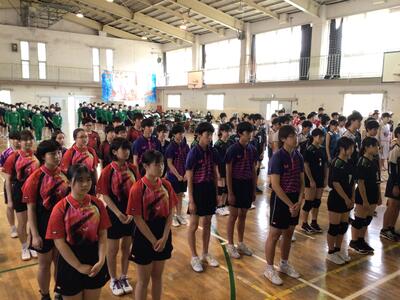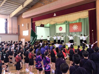 来週開催される支部中体連大会に向けて、本日の午後に激励会が開催されました。生徒会本部が準備など、会の運営を務め、応援団と全校生徒で各運動部の選手たちへエールを送りました。