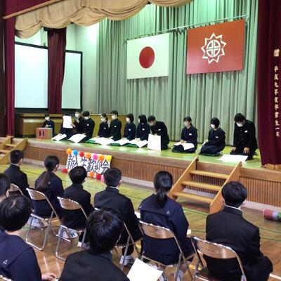 本日の4校時に修学旅行の結団式が体育館で行われました。3年生は明日12日〜14日まで、2泊3日の予定で関東方面(東京・鎌倉・舞浜)を訪れ、計画に基づいてフィールドワークなどを実施する予定です。生徒たちが立てたスローガン 「相互扶助」〜互いに協力し、思い出に残る修学旅行にしよう〜 のもと、様々な人との関わりを大切にしながら、友人たちと過ごす最高のひと時を思い切り楽しんで来てほしいと思います。