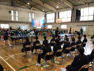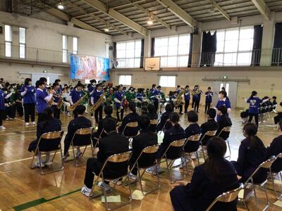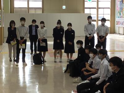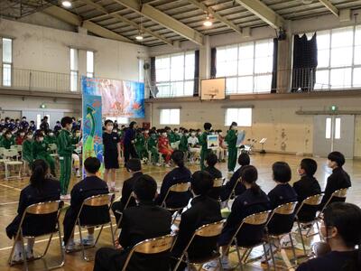 本日の午後には、新入生歓迎会が体育館で行われました。生徒会からは、テレビ番組の「笑点」を模した大喜利形式での専門委員会の紹介があり、会場を沸かせました。また部活動紹介では、運動部や吹奏楽部などの実演を交えた発表や勧誘があり、1年生も楽しそうに見入っていました。今日の説明や今後の見学などを参考に、自分の所属する専門委員会や部活動をじっくり考えてほしいと思います。