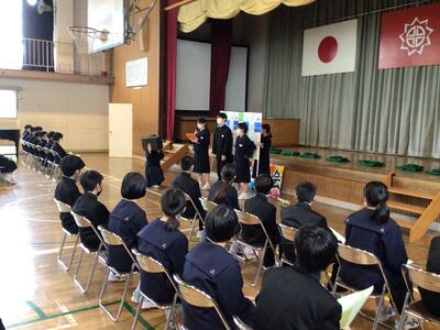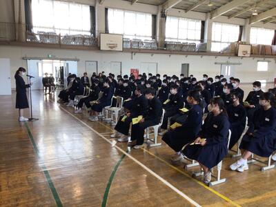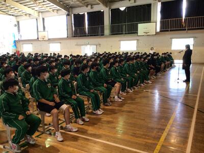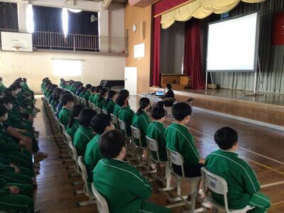2023年4月19日 15時49分本日の6校時には、体育館に全校生が集まり、交通安全教室が実施されました。自転車のルールや学区内における危険な交差点などについて、映像を交えて確認がなされました。渡利学区にはトンネルもあり、特に南向台などからの自転車登校はスピードも出て、過去において事故も何件か起こっているのが現状です。ヘルメットの正しい着用を心掛け、自分の命をしっかり守って、安全な登下校を心掛けてほしいと思います。
