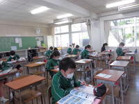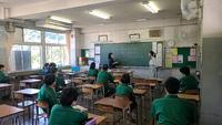 5月28日(木)、1・2年生は26日と班を変えて分散登校をしました。1年生は知能検査を行い、2年生の理科の授業では、映像を見て「地層」について学んでいました。この日は知能検査の影響でノーチャイムでの生活となりました。